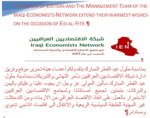 بمناسبة حلول عيد الفطر المبارك يتقدم لكم أعضاء هيئة تحرير موقع وفريق ادارة شبكة الاقتصاديين العراقيين بأحر التهاني والتبريكات بمناسبة حلول عيد الفطر المبارك سألين المولى عز وجل ان يعيده علينا وعليكم باليمن والبركات متمنين لجميع أصدقائنا ولمجتمع الاقتصاديين العراقيين الاستمرار بالعمل على انقاذ الاقتصاد العراقي من الازمات ومن التدخلات غير المهنية للطبقة السياسية الريعية والانتقال الى اقتصاد انتاجي تنموي ومستدام.